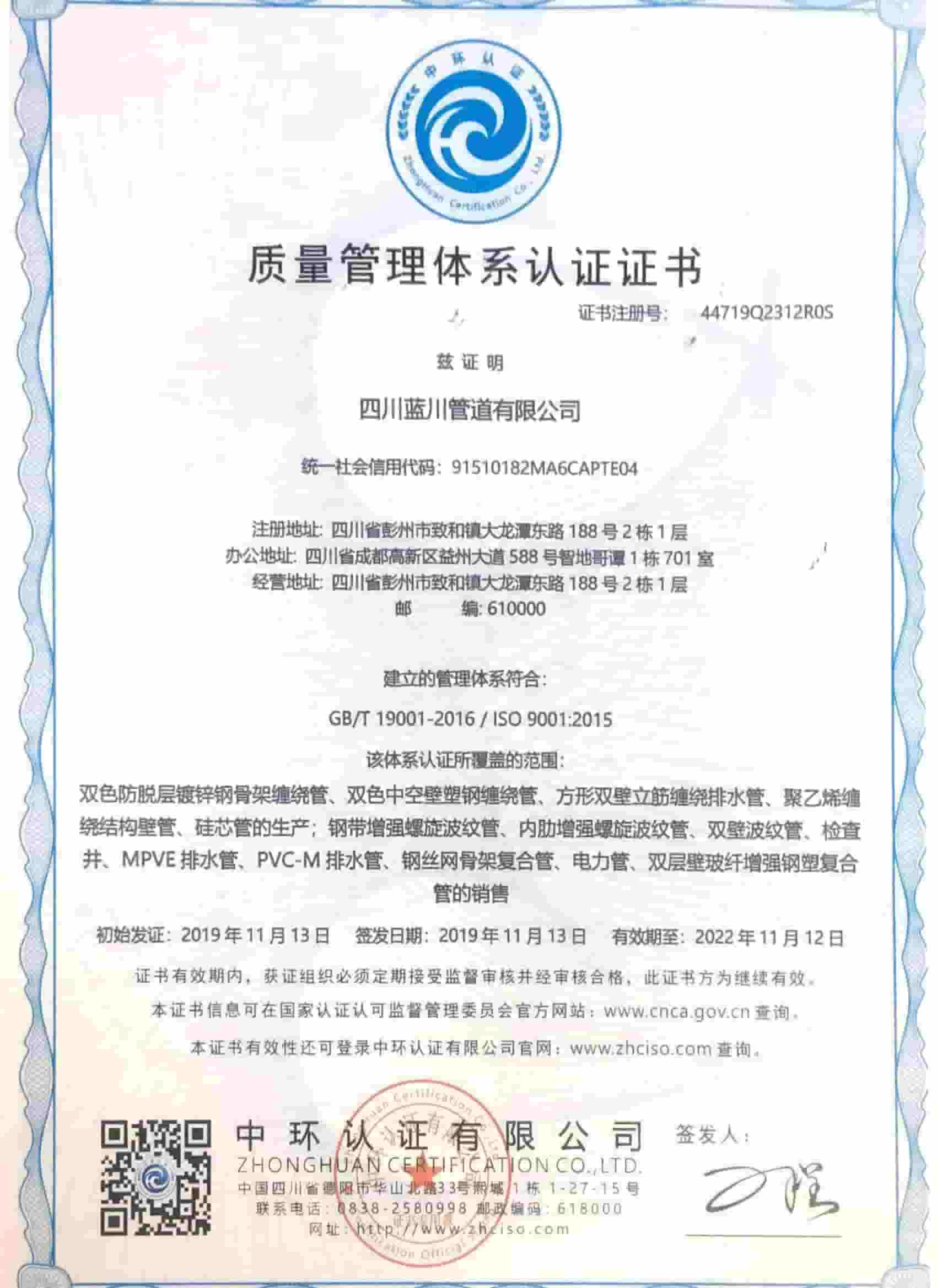 四川藍川管道有限公司(成都藍川科技有限公司)成立于2012年,生產基地坐落于“牡丹之城”四川彭州市工業開發區,營運中心位于成都市高新區益州大道,注冊資本5仟萬,占地面積2萬余平米,年生產能力達1萬噸以上;是一家專業研發、生產、銷售新型市政工程管道的高新技術企業。目前擁有大型市政排水管生產線5條,給水管生產線5條,電力管生產線2條。主要產品有:防脫層鍍鋅鋼骨架纏繞管、雙層壁克拉管、雙色中空壁塑鋼纏繞管、方形雙壁立筋纏繞管、內肋管、雙壁波紋管、給水管、電力管、硅芯管等。 公司是四川省湖南商會“常務副會長單位”和“創新湘商”,中國塑料加工工業協會“塑料管道專業委員會會員單位”,獲得了30余項發明專利和實用新型專利,2020年評為《高新技術企業》,公司通過了《質量管理體系認證證書ISO9001:2015》,《職業健康安全管理體系認證證書OHSAS18001:2018》,《環境管理體系認證證書ISO14001:2015》;公司于2019年主編了《雙色防脫層玻璃纖維增強鍍鋅鋼骨架纏繞管》T/SCSX0906-2019,《雙壁纖維網鋼塑復合管》T/SCSX0916-2019,兩項團體標準,并獲得了四川建設科技發展中心頒發的《四川省建設領域科技成果或應用技術備案證書》;公司“藍川”牌雙孔雙色共擠中空壁塑鋼纏繞聚乙烯管道、GSRC雙色雙層共擠玻纖增強防脫層鍍鋅鋼骨架纏繞管、方形雙壁立筋纏繞管、玻璃纖維增強內肋硅芯層塑料電纜導管系列產品多次被中國企業發展促進委員會、中國優質品牌統計中評定為“綠色環保推薦企業”、“工程建設推薦產品”、“質量.服務誠信AAA企業”、“質量檢驗.國家標準合格產品”、“中國自主創新產品”。